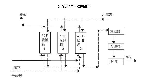 工藝敘述 ACF有機廢氣吸附回收裝置由預(yù)處理系統(tǒng)、吸附系統(tǒng)、解析系統(tǒng)、管路系統(tǒng)、冷凝回收系統(tǒng)等部分組成。整個工藝流程如圖所示,三個吸附箱分別進行吸附、解析、干燥工序。當(dāng)有機廢氣進入吸附箱后,其中的有機物穿過活性炭纖維后被吸附下來,凈化后的氣體由吸附箱頂部排出。A、B、C三個吸附箱交替切換。采用低壓水蒸汽為脫附劑進行解吸,由吸附箱頂部進入,穿過活性炭纖維床,將被吸附濃縮的有機物脫附出來并帶入冷凝器,經(jīng)過冷凝,有機物和水蒸汽的混合物被冷凝下來流入分層槽。如果吸附的有機物不溶于水,則混合物進入分層槽通過重力沉降分離,達到回收有機物的目的,分離后的污水排放至廠方化學(xué)污水系統(tǒng)集中處理后排放;如需處理的有機物溶于水或水中溶解度較大則必須進行后處理(如精餾等)。系統(tǒng)運行過程中所有的動作切換,均由控制系統(tǒng)自動完成。(注:根據(jù)工藝要求,可設(shè)計為雙箱或多箱系統(tǒng) )